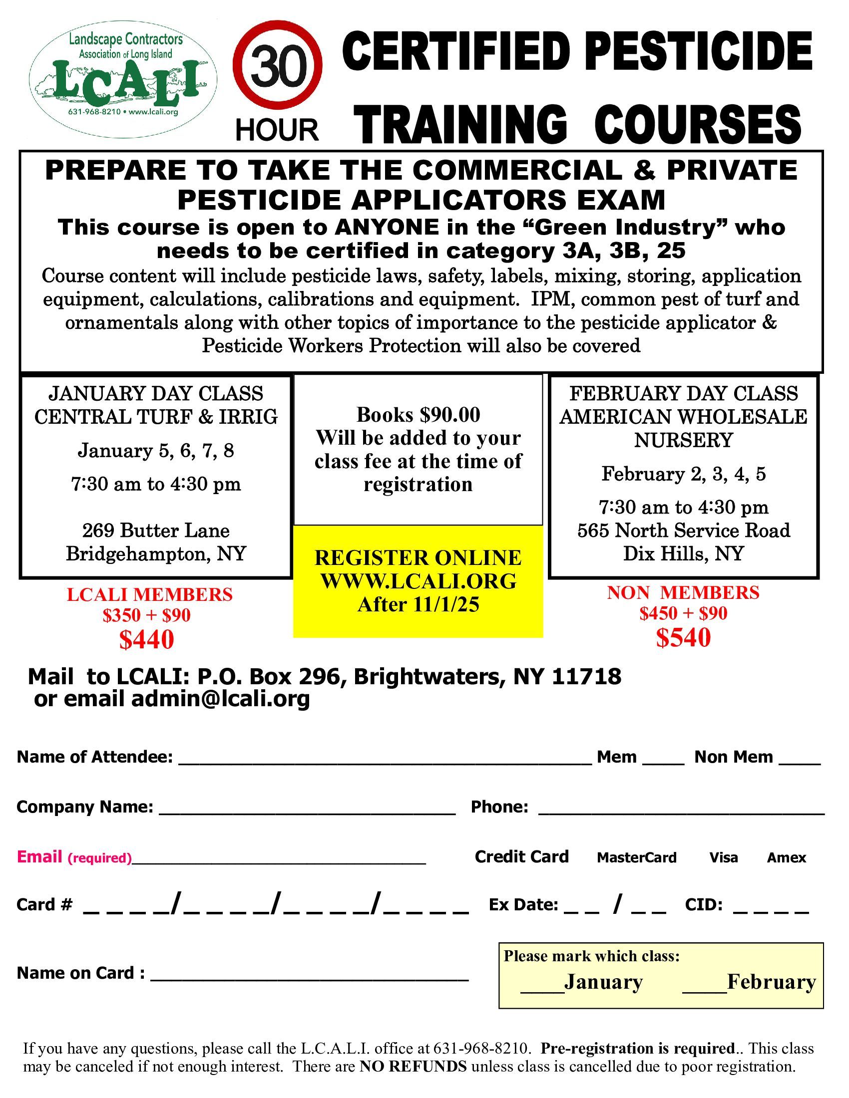 Course content will include pesticide laws, safety, labels, mixing, storing, application equipment, calculations, calibrations and equipment. IPM, common pest of turf and ornamentals along with other topics of importance to the pesticide applicator & Pesticide Workers Protection will also be covered.